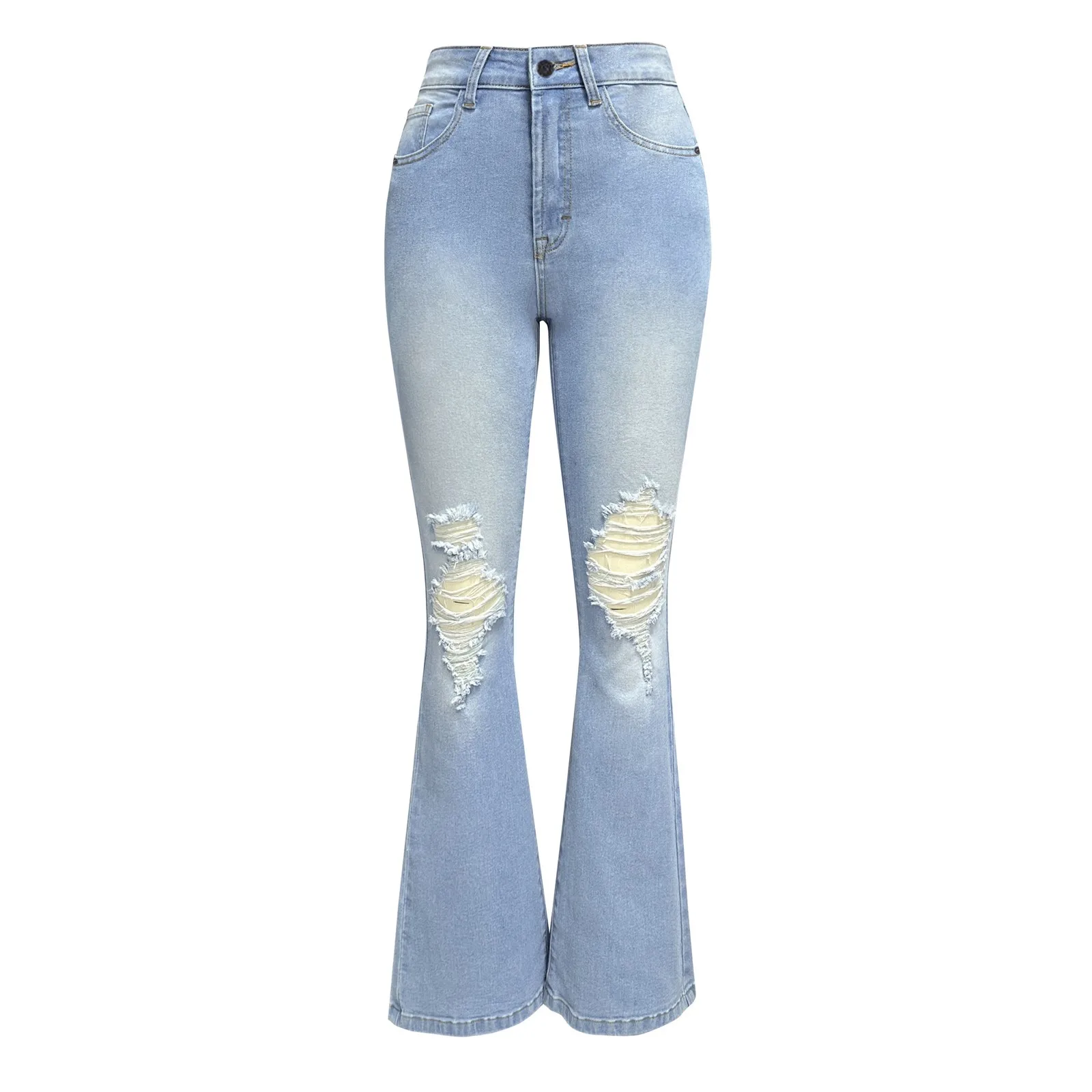 Women Ripped Flared Jeans Mid Waist Wide Leg Bootcut Denim Pants Streetwear Vintage Blue Trousers