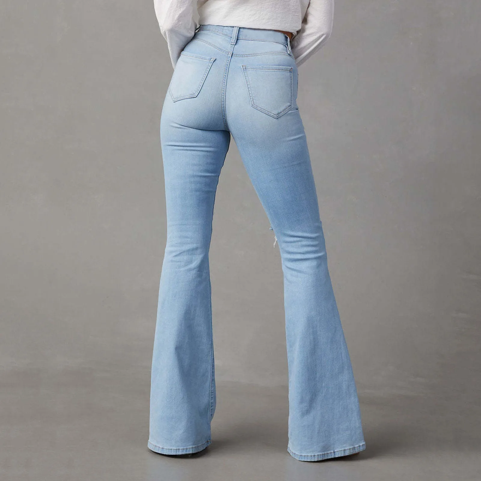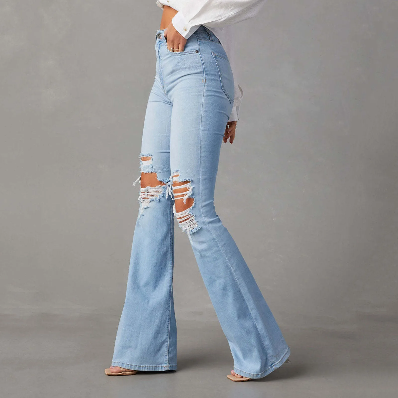 : Ripped flare jeans, easy to pair with blouse, shirt, tunic top, denim jackets, high heels, sneakers for casual